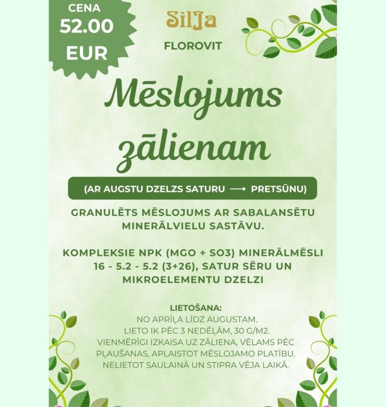 Īpašais FLOROVIT zāliena mēslojuma piedāvājums! Granulēts mēslojums ar sabalansētu minerālvielu sastāvu.Kompleksie NPK (MgO + SO3) minerālmēsli 16 - 5.2 - 5.2 (3+26), satur sēru un... Lasīt tālāk