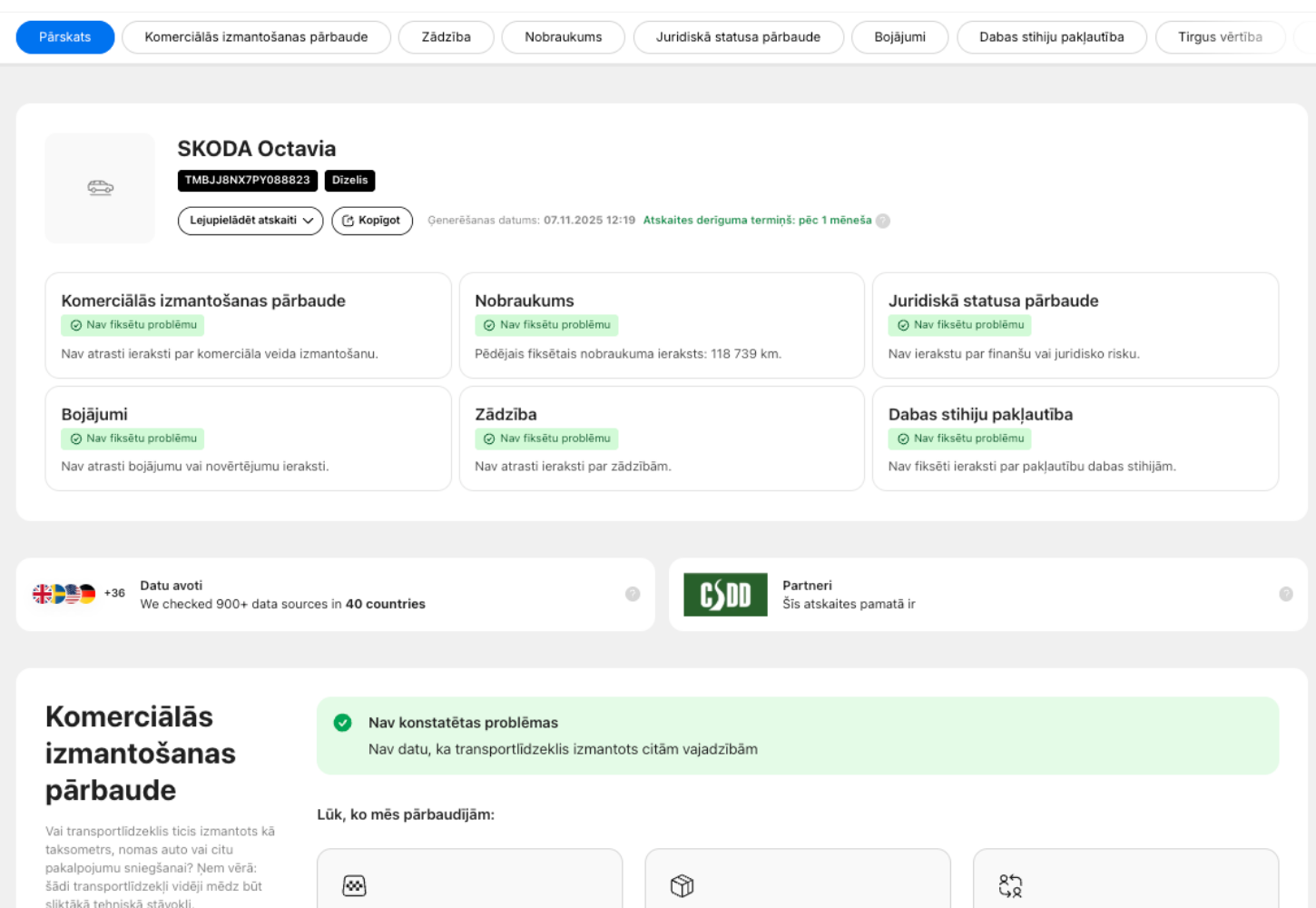 Pilnīgi tīra CarVertical atskaite – bez avārijām un ar pārbaudītu nobraukumu (skat. pievienoto atskaites bildi).